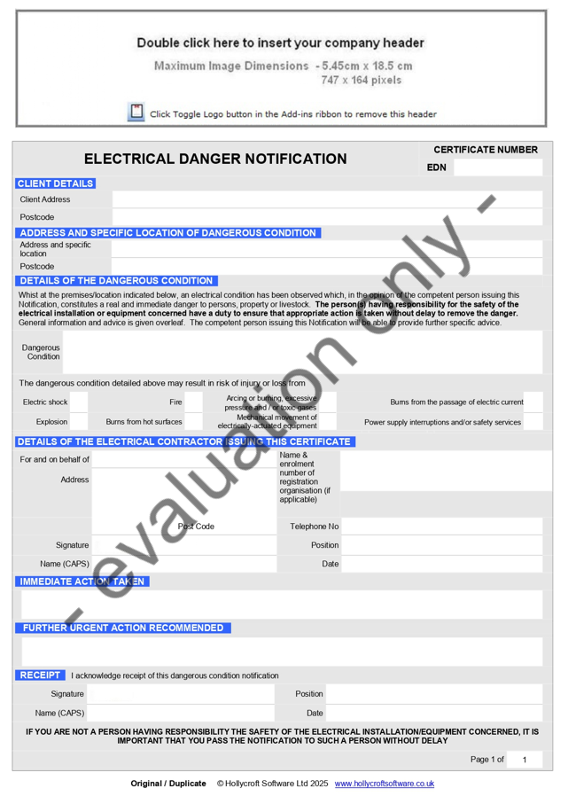 Software features to save you timeClient and Site DatabaseSelect client and site details directly from your database - no retyping, no inconsistencies, and no missed information across multiple forms. Integrated Contractor Database & Electronic SignaturesAutomatically populate contractor details from your database and apply electronic signatures to the Electrical Danger Notification, ensuring the issuing competent person is clearly identified and the document is formally completed without delay. Built-in Date SelectorQuickly insert dates using an integrated date selector, reducing typing errors and speeding up form completion.