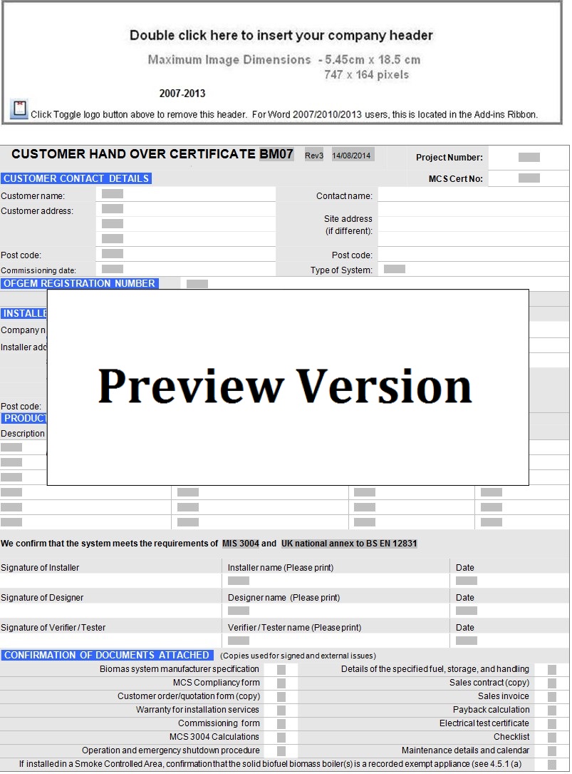 Customer Handover Certificate Screenshot