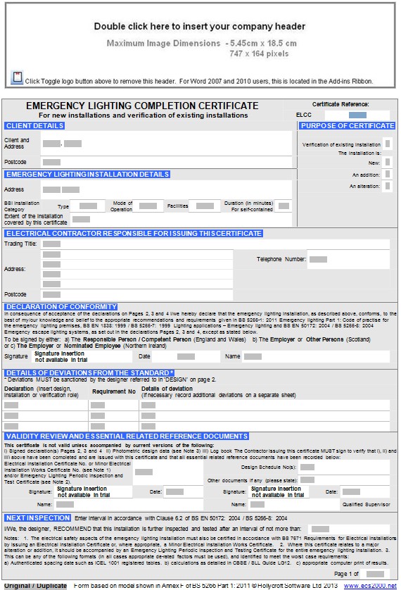 Emergency Lighting Completion Certificate - Page 1