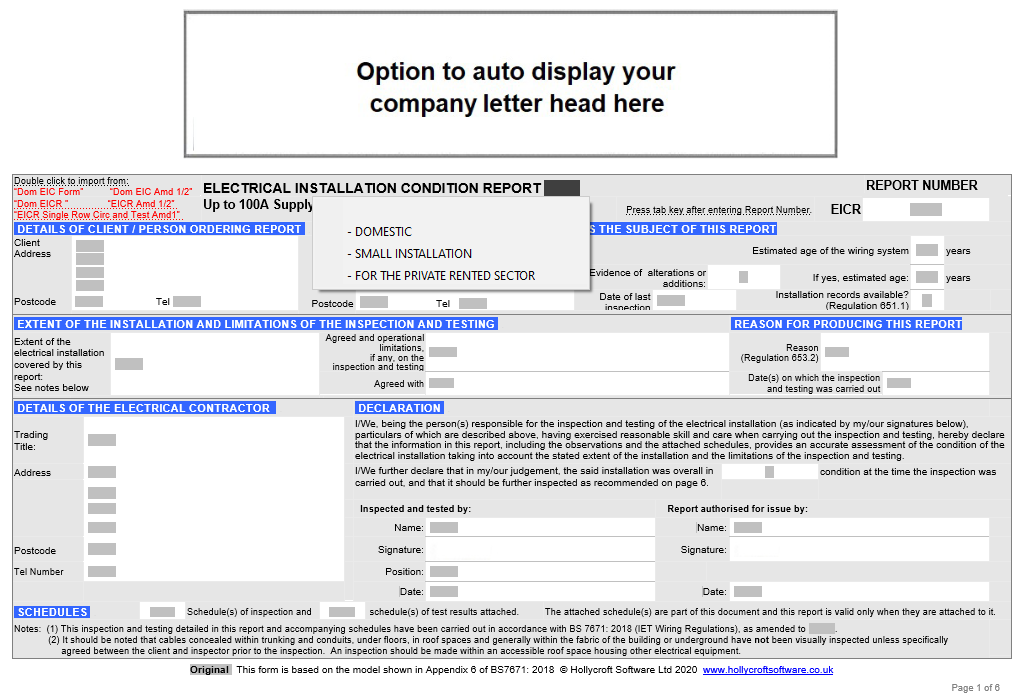 Our EICR form can be used to display: - Domestic, - Small Installation, - For the Private Rented Sector