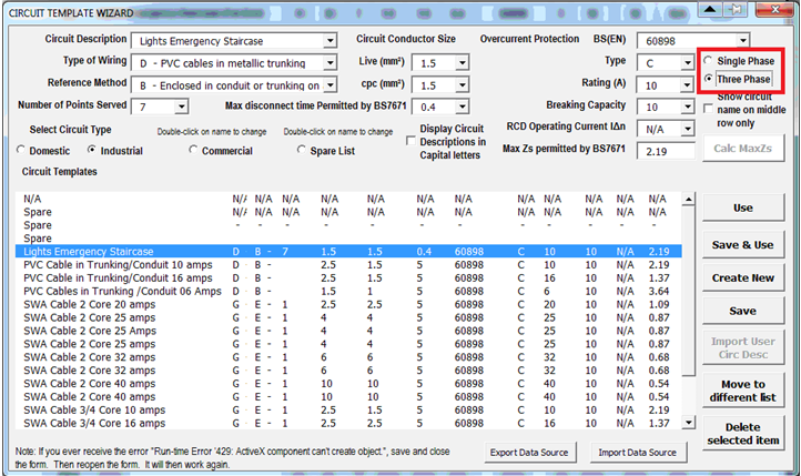 There is the facility for adding 3-phase circuits to the certificate. Choose the circuit type you want, modify the circuit description, choose “Three Phase” option (shown in red box below).